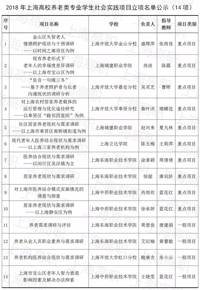 据悉,上海高校养老类专业建设服务平台为提高养老类专业人才培养质量,通过项目训练实现学生内涵发展,发现和培养一批在养老专业中有作为、有潜力的优秀人才,特设立高校养老类专业学生社会实践项目立项去年8月,经过项目申报和答辩,我校护理学院肖雨欣、徐承妍、王晓雯等同学在蓝花红老师指导下的三个项目在众多项目中脱颖而出,均获立项,其中肖雨欣同学团队的《对上海市医养结合模式实施情况的调查与探索》,徐承妍同学团队的《居家养老现状与需求调研——以上海静安区为例》获批重点项目。在校生获得上海市级重点项目是罕见的,在我校也不多见。