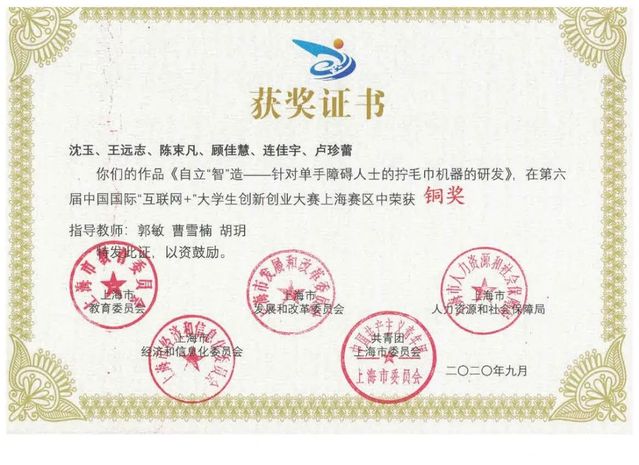 在第六届中国国际“互联网+”大学生创新创业大赛上海市赛(职教赛道)中,我院《自立“智”造——针对单手障碍人士的拧毛巾机器的研发》获上海赛区铜奖。