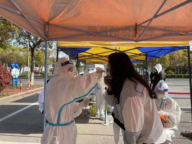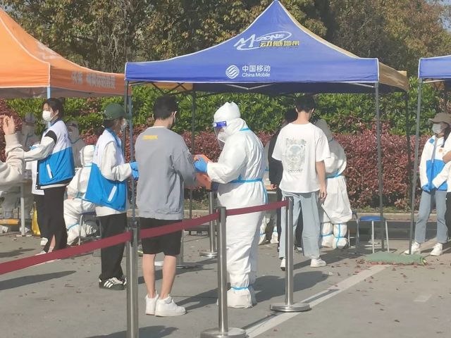 核酸采样现场,来自护理的“大白”们严格按照防控要求,全副武装为同学们进行核酸采样。“请打开健康登记码”,“来,仰头,张口……啊~”,耐心的沟通、娴熟的动作,探喉、擦拭、采集样品……配合采样的师生们从摘下口罩,配合医护人员采集咽拭子,到迅速安全离开,整个过程短暂而迅速,井然有序。