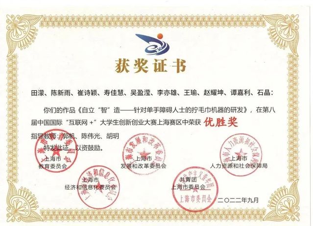 上海赛区优胜奖:《自立“智”造——针对单手障碍人士的拧毛巾机器的研发》