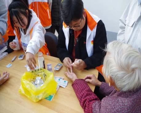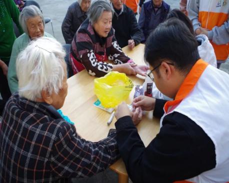 志愿者们来到张堰镇解放社区有条不紊的展开服务活动,他们首先为老人们测量血糖,在测量期间志愿者们充分发挥了专业特长,热心地为老人们解答关于身体健康的疑问,并提出了合理的小建议。
