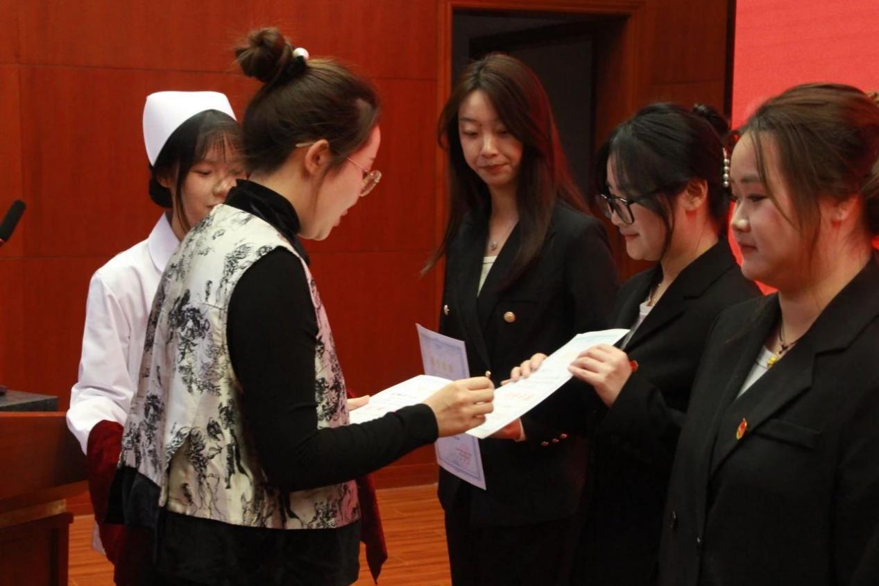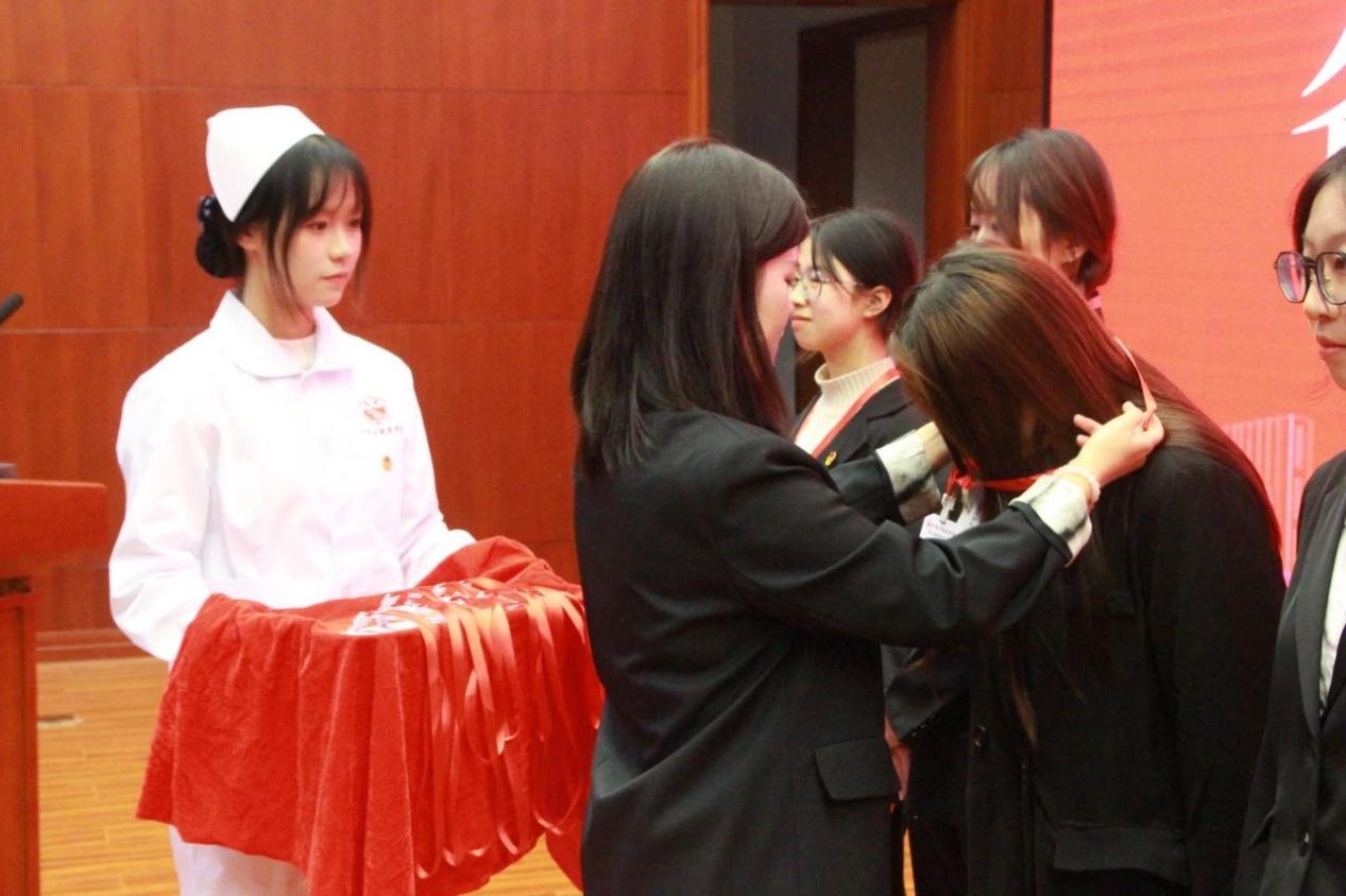 英国上市公司365团委书记张玲为我院第五届团委、学生会各职能部门干事佩戴工牌
