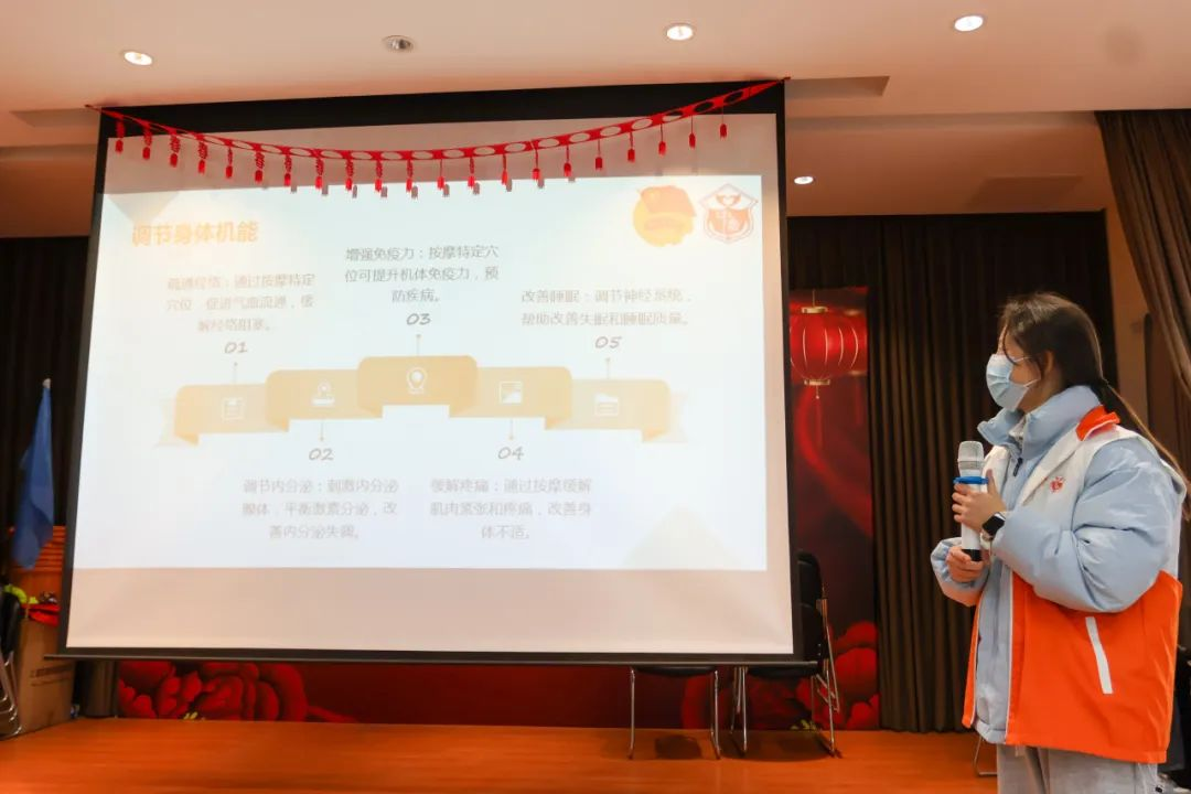 随后,主讲人上台进行了中医知识的宣讲,分享如何通过不同手法的按摩达到疏通经络、调节内分泌、增强免疫力、缓解疼痛,以及改善睡眠的作用。