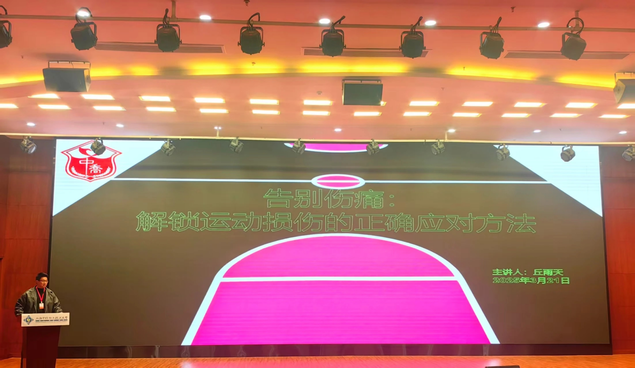 讲座伊始,主讲人丘雨天首先从运动损伤的分类说起,详细介绍了运动损伤发生的原因,指出篮球、足球、羽毛球等项目的伤病特点。他特别强调,科学的运动方法和良好的拉伸习惯是预防运动损伤的关键,提醒同学们在运动前要充分热身,运动中注意技巧与力量的合理运用,运动后适当拉伸放松,以减少不必要的伤害。