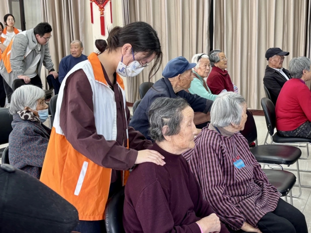 在活动开始前,考虑到部分老人可能存在行动不便的问题,志愿者们耐心搀扶、逐一引导,小心翼翼地协助老人们入场。