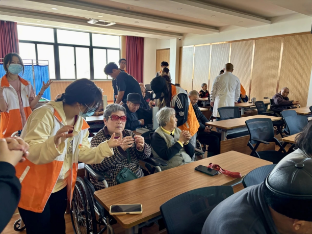 随后,志愿者们带领老人们一起练习手指操,帮助老人活动手指,促进血液循环。老人们在志愿者的引导下,认真地完成每一个动作,现场气氛活跃,老人们积极参与。