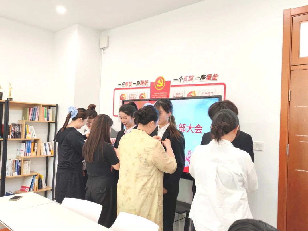 接着,由入党介绍人给四位中共预备党员佩戴党徽。