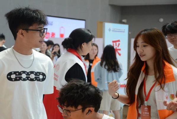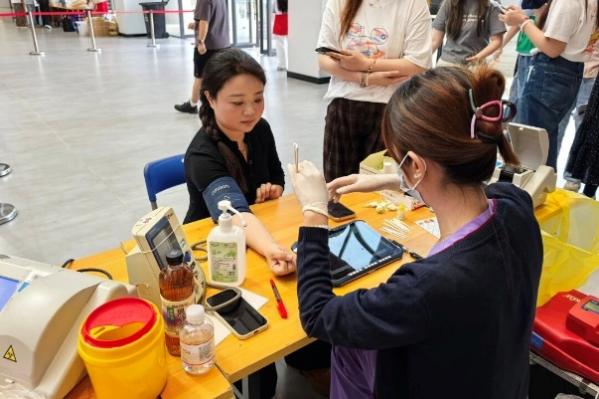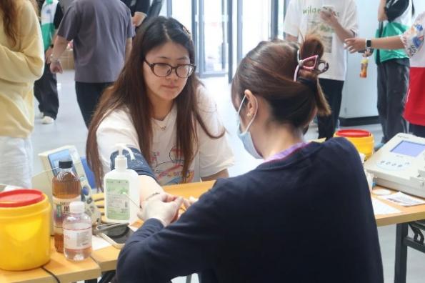 在志愿者的引导下,献血师生有序签到,规范测量血压,进行抽血化验,整个流程有条不紊。