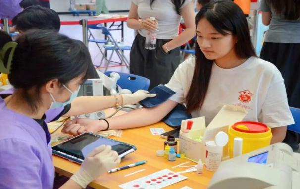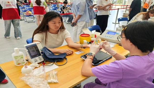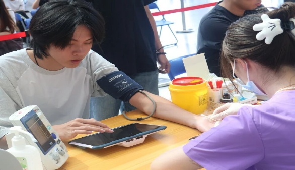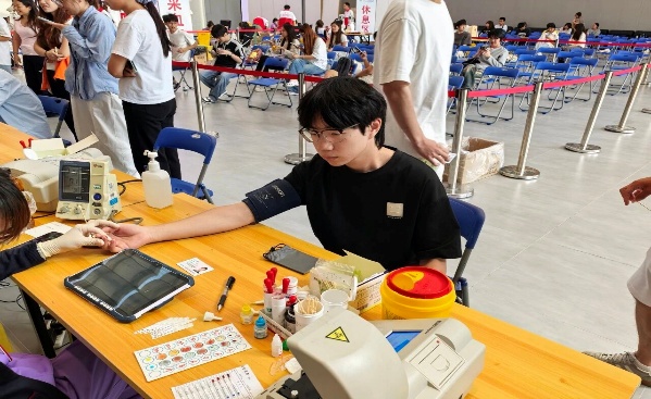 体检时,同学们严格遵求、积极配合医护人员。从年龄、体重筛查,到血压、体温检测,再到健康状况询问,各环节尽显献血活动的严谨专业。资格筛查后,符合条件的同学为能参与公益献血而开心;部分指标暂未达标的同学虽有遗憾,但表示会注意作息、加强锻炼,期待下次加入奉献力量。