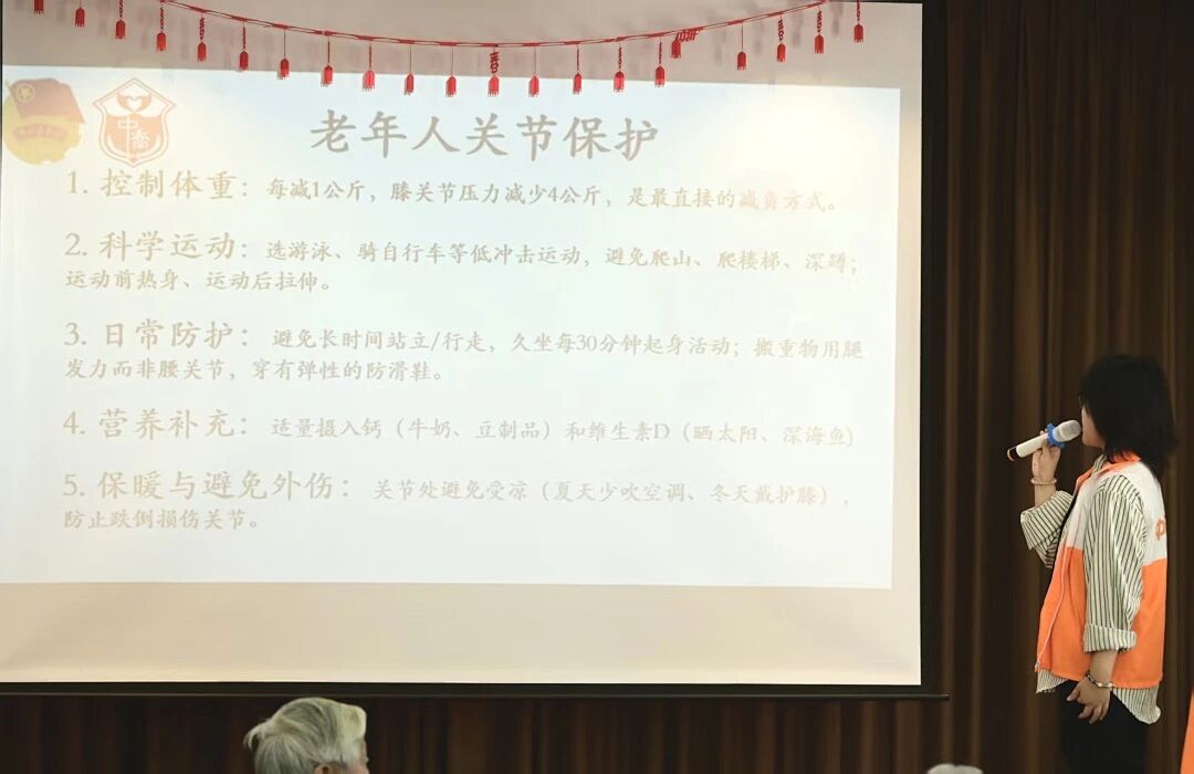 随后,志愿者们针对老人常见的关节问题,开展了关节保护宣讲活动。他们用通俗易懂的语言讲解关节养护的误区及运动要点。同时,他们带领老人们做养生拍打操,手把手指导拍打肩颈、腰背等部位,帮助老人们活动筋骨,有效缓解肢体僵硬等问题。