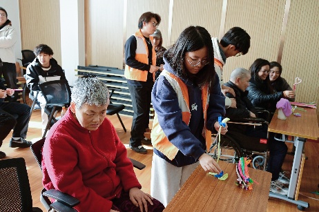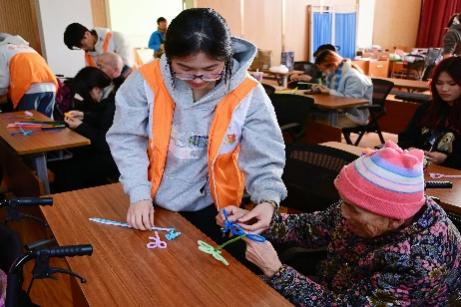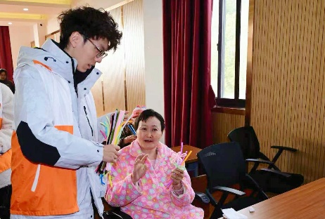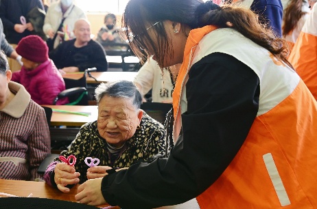 临近活动尾声,趣味十足的 “扭扭棒” 手工互动环节使现场氛围暖意融融,志愿者们手把手指导老人们弯折、拼接扭扭棒,协助大家制作各类可爱手工艺品。对行动不便的老人,志愿者们则贴心送上提前备好的成品礼物。小小的扭扭棒,不仅扭出了创意与乐趣,更串联起志愿者与老人们的温暖情谊,定格了美好瞬间。