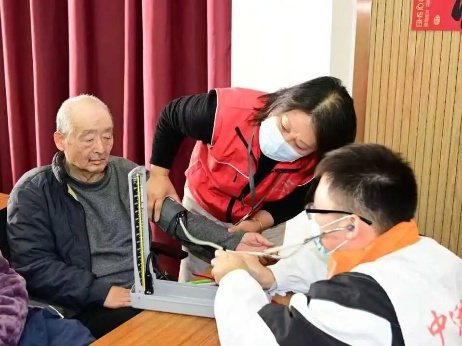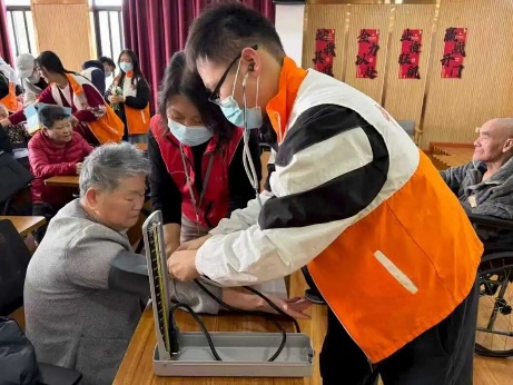 活动伊始,志愿者们热情问候院内老人,细致询问其饮食起居与身体状况,大家充分发挥专业所长,为老人们测量血压并详实记录数据,结合检测结果提供科学实用的健康建议,以专业素养与耐心关怀为老人们的健康保驾护航。