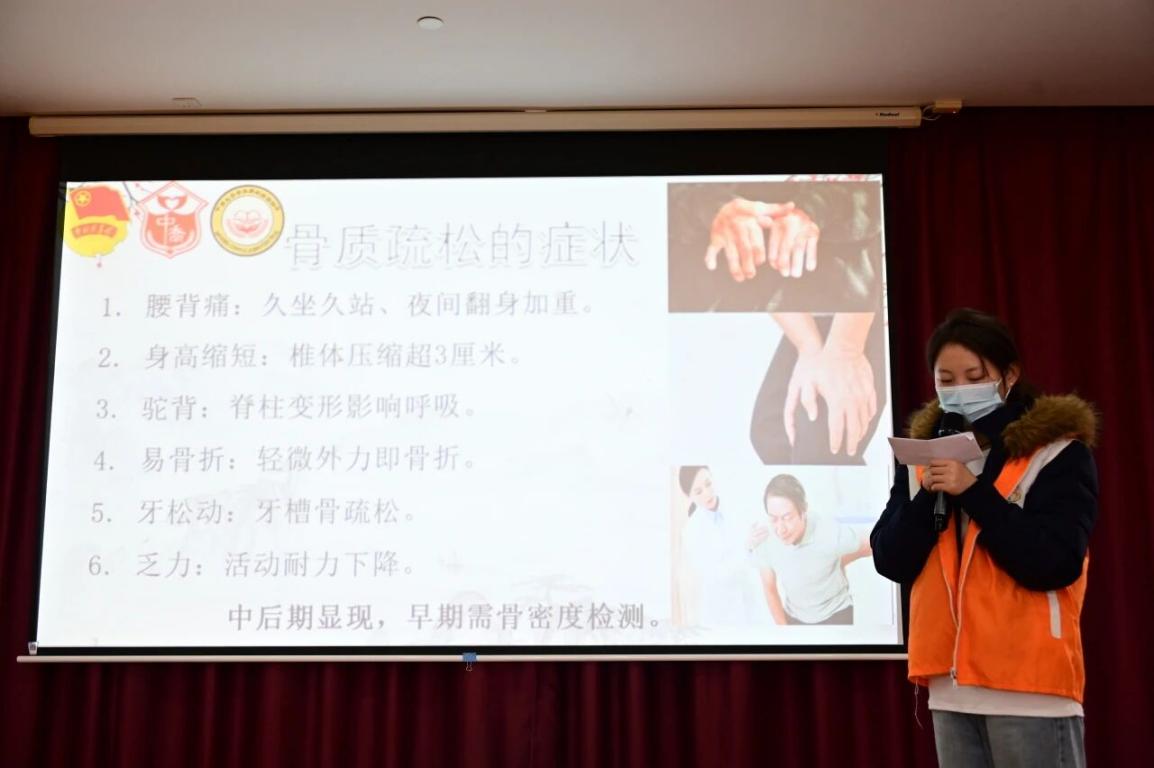 随后,志愿者们围绕“骨质疏松”开展专题宣讲,将党建服务民生的理念融入科普过程,向老人们普及疾病成因、症状及防护要点,指导其通过合理饮食、适度运动等方式科学预防。宣讲结束后,志愿者们带领老人们学习简单易学的拍打操,伴随着轻快节奏,老人们紧跟示范认真练习,通过简单的拍打动作促进血液循环、活动关节,让这场健康服务饱含党建引领的暖心关怀。